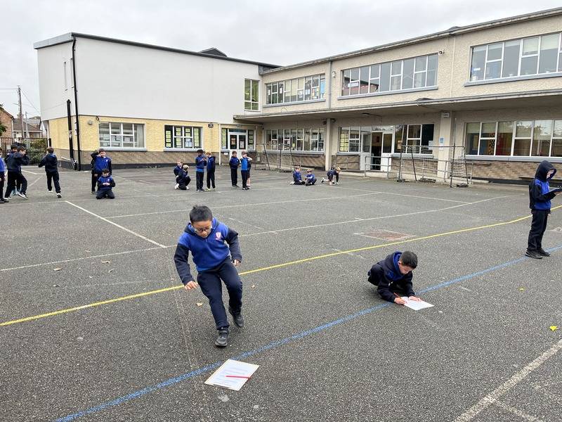 We celebrated Maths Week last week.  On Tuesday we merged PE and Maths together and had a Maths Relay Race.  We were split into five teams. Each team member had to run to a certain spot and answer the Maths question on the clipboard.  Points were given for both correct answers and the overall times it took each team to complete all the questions.  The winners received green cards.
