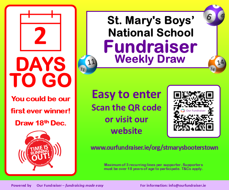FUNDRAISING WEEKLY DRAW: St. Mary's Boys' National School is launching its weekly fundraiser draw this week. The money raised from this fundraising initiative will be used to directly support your children's education and purchase resources for our school including sports equipment, sports coaching, classroom and teaching resources. Our first draw will be on Thursday 18th December at 20:00. Please see the fundraiser link button on our website. We hope that the weekly option of 1 line for €2.50 will allow everybody to contribute, but it would be hugely appreciated if you can contribute €5 for 3 lines, and you never know you might just win! Please pass the word on and invite friends and family. Weekly Lotto Fundraiser