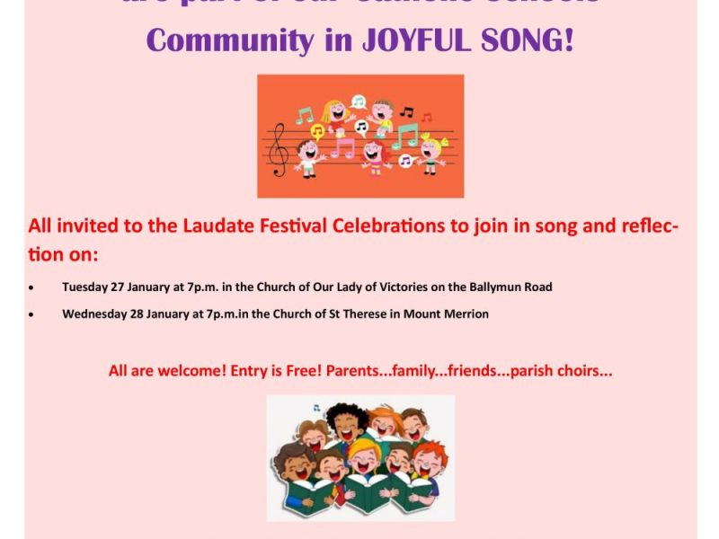 LAUDATE CELEBRATIONS 2026: Laudate celebrates our pupils and all who are part of Catholic Schools Community in song and reflectionsl. All are welcome; parents, families, friends, neighbours and parish choirs. Entry is free. It will be held in the Tuesday 27th of January at 19:00 in Our Lady of Victories, Ballymun Road. If you cannot make that evening Laudate Celebrations 2026 will also be held on Wednesday 28th of January at 19:00 in the nearer Church of St. Therese, Mount Merrion.